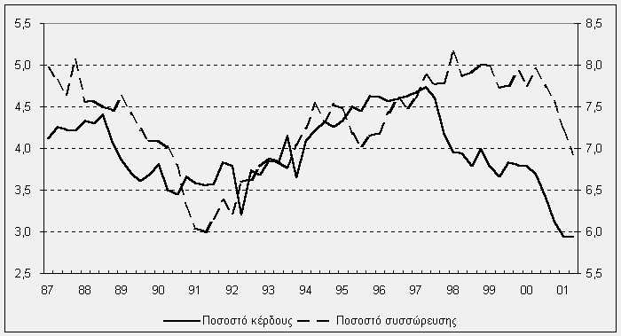 Η μείωση του ποσοστού του κέρδους προέρχεται από δύο συνδυασμένες επιπτώσεις. Καταρχήν, το μερίδιο των μισθών αυξάνει: η μάζα των μισθών που δίνει ο ιδιωτικός τομέας αυξάνει κατά 30% από το 1997 ώς το 2001, ενώ το ΑΕΠ αυξάνει την ίδια περίοδο κατά 21,5%. Κατά δεύτερον, μπορούμε να παρατηρήσουμε μια ταυτόχρονη αύξηση της οργανικής σύνθεσης του κεφαλαίου. Η σχέση κεφάλαιο προς προϊόν αυξήθηκε, έτσι, κατά 17% σε όγκο και κατά 10% σε αξία. Με άλλα λόγια, ο μεγαλύτερο φορτίο του κεφαλαίου μαζί με τη μείωση του ποσοστού εκμετάλλευσης συμπράττουν προς μια υποχώρηση του ποσοστού του κέρδους. Καθώς η επένδυση συνέχισε στο ενδιάμεσο, καταλήγουμε αρκετά λογικά σε μια υπερσυσσώρευση που εκδηλώνεται με τη συγκρότηση πλεονασματικών ικανοτήτων σε σχέση με τις συνθήκες της αποδοτικότητας. Το πλεόνασμα αυτό παίρνει τη μορφή μιας υποχώρησης του ποσοστού χρησιμοποίησης των παραγωγικών ικανοτήτων: τον Αύγουστο του 2001, ήταν 76,2%, δηλαδή βρισκόταν στο πιο χαμηλό της σημείο από την ύφεση του 1982. Η πτώση αυτή αγγίζει ιδιαίτερα τις βιομηχανίες υψηλής τεχνολογίας, όπου το ποσοστό χρησιμοποίησης των ικανοτήτων περνάει από το 88% το 1995 στο 63,4% το 2001. Είναι επομένως οι συμβολικοί τομείς της «νέας οικονομίας» που ακριβώς πλήττονται το περισσότερο.