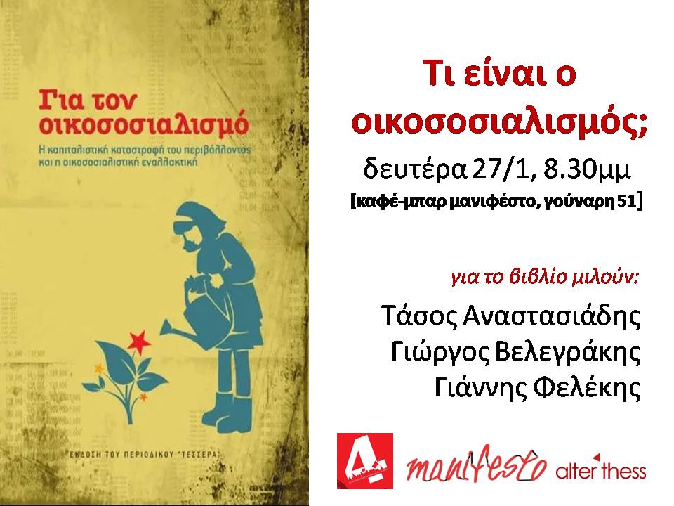 Τη Δευτέρα 27 Γενάρη, στις 8,30μμ, στο καφέ-μπαρ Manifesto, συζητάμε το βιβλίο «Για τον οικοσοσιαλισμό», την ελληνική έκδοση του οποίου επιμελήθηκε το περιοδικό «Τέσσερα».