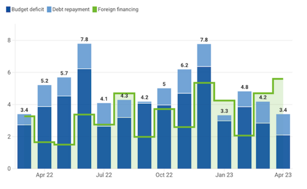 Γράφημα 2: Οι χρηματοδοτήσεις από το εξωτερικό αποτελούν ουσιαστική πηγή για την κάλυψη του δημοσιονομικού ελλείμματος της κυβέρνησης (σε δισεκατομμύρια δολάρια ΗΠΑ).